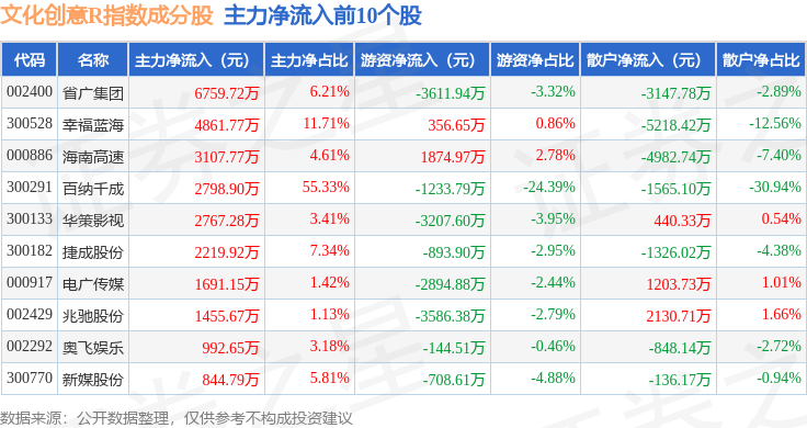 资金流向方面,文化创意R(480046)指数成份股当日主力资金净流出合计19.34亿元,游资资金净流入合计8939.61万元,散户资金净流入合计18.45亿元。成份股资金流向详情见下表: