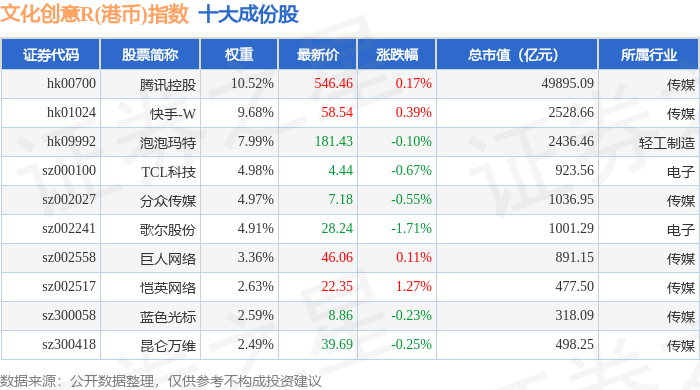 文化创意R(港币)(480047)指数十大成份股详情如下: