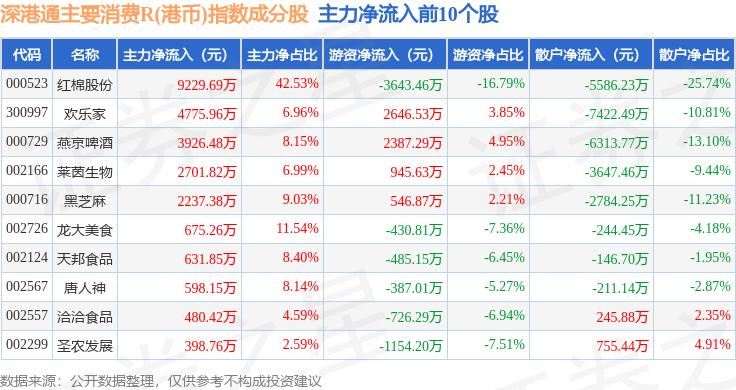 资金流向方面,深港通主要消费R(港币)(483022)指数成份股当日主力资金净流出合计9.02亿元,游资资金净流入合计1.73亿元,散户资金净流入合计7.29亿元。成份股资金流向详情见下表:
