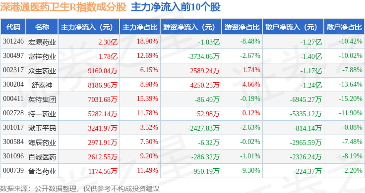 资金流向方面,深港通医药卫生R(483023)指数成份股当日主力资金净流出合计15.42亿元,游资资金净流入合计7992.89万元,散户资金净流入合计14.62亿元。成份股资金流向详情见下表: