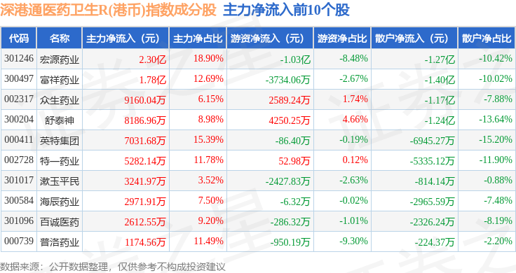 资金流向方面,深港通医药卫生R(港币)(483024)指数成份股当日主力资金净流出合计15.42亿元,游资资金净流入合计7992.89万元,散户资金净流入合计14.62亿元。成份股资金流向详情见下表:
