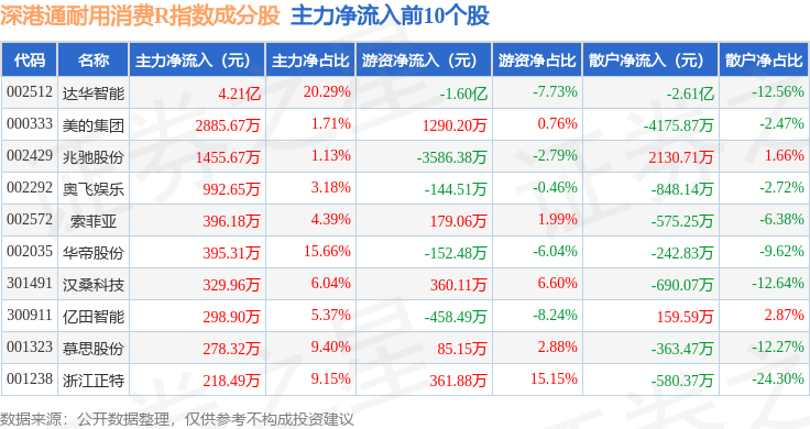资金流向方面,深港通耐用消费R(483049)指数成份股当日主力资金净流出合计7.12亿元,游资资金净流入合计7195.38万元,散户资金净流入合计6.4亿元。成份股资金流向详情见下表: