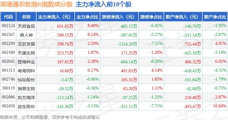 资金流向方面,深港通农牧渔R(483051)指数成份股当日主力资金净流出合计2.38亿元,游资资金净流入合计8553.14万元,散户资金净流入合计1.53亿元。成份股资金流向详情见下表: