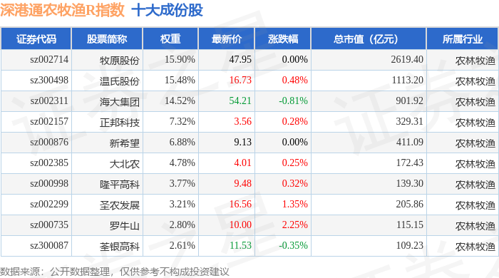 深港通农牧渔R(483051)指数十大成份股详情如下: