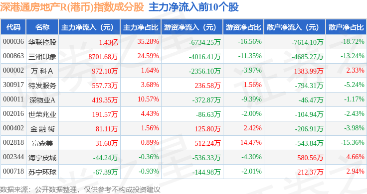 资金流向方面,深港通房地产R(港币)(483072)指数成份股当日主力资金净流出合计1.05亿元,游资资金净流出合计8854.83万元,散户资金净流入合计1.94亿元。成份股资金流向详情见下表: