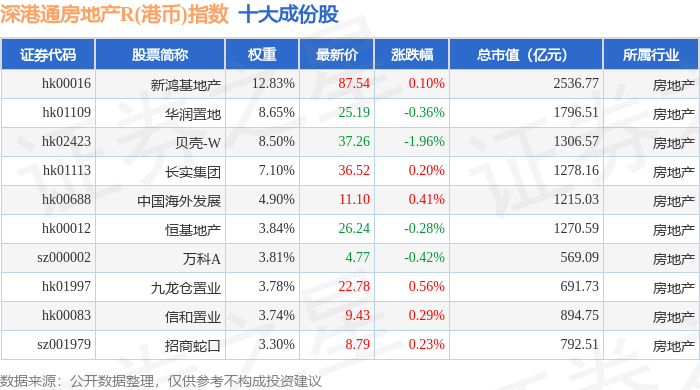 深港通房地产R(港币)(483072)指数十大成份股详情如下: