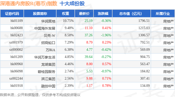 深港通内房股R(港币)(483084)指数十大成份股详情如下: