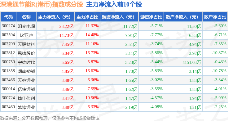 资金流向方面,深港通节能R(港币)(483086)指数成份股当日主力资金净流入合计65.12亿元,游资资金净流出合计31.74亿元,散户资金净流出合计33.39亿元。成份股资金流向详情见下表: