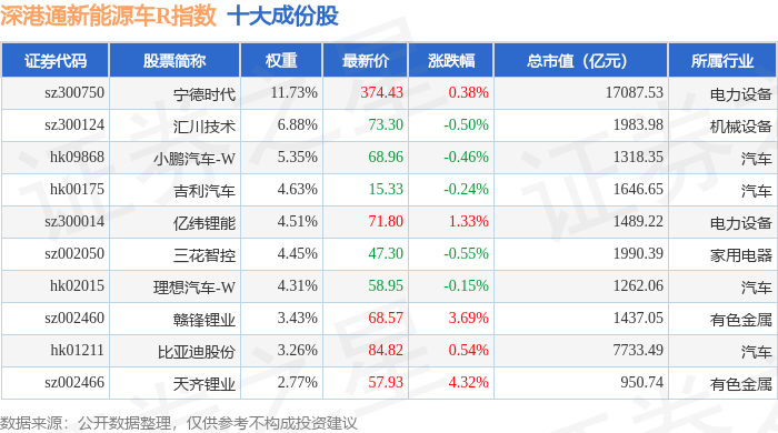 深港通新能源车R(483087)指数十大成份股详情如下:
