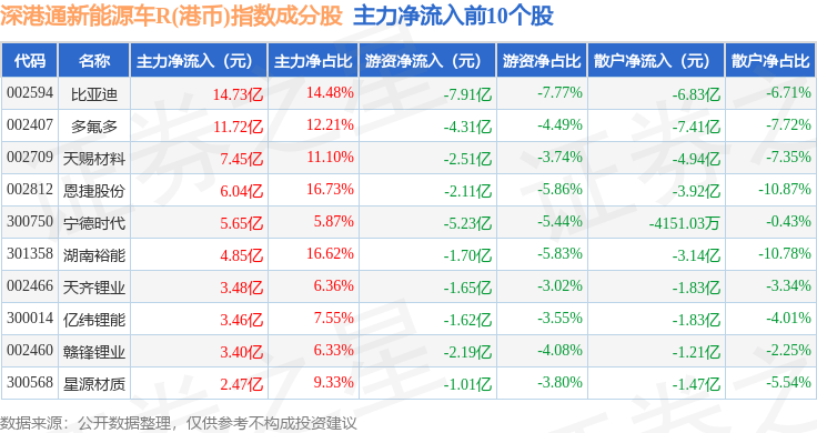 资金流向方面,深港通新能源车R(港币)(483088)指数成份股当日主力资金净流入合计50.45亿元,游资资金净流出合计27.31亿元,散户资金净流出合计23.14亿元。成份股资金流向详情见下表: