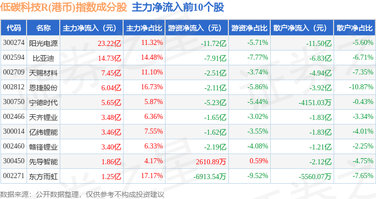 资金流向方面,低碳科技R(港币)(483161)指数成份股当日主力资金净流入合计51.49亿元,游资资金净流出合计27.33亿元,散户资金净流出合计24.16亿元。成份股资金流向详情见下表: