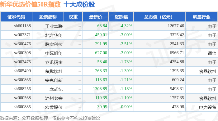 新华优选价值50R(489004)指数十大成份股详情如下: