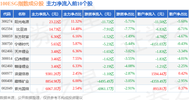 资金流向方面,100ESG(970027)指数成份股当日主力资金净流出合计17.58亿元,游资资金净流出合计3.7亿元,散户资金净流入合计21.28亿元。成份股资金流向详情见下表: