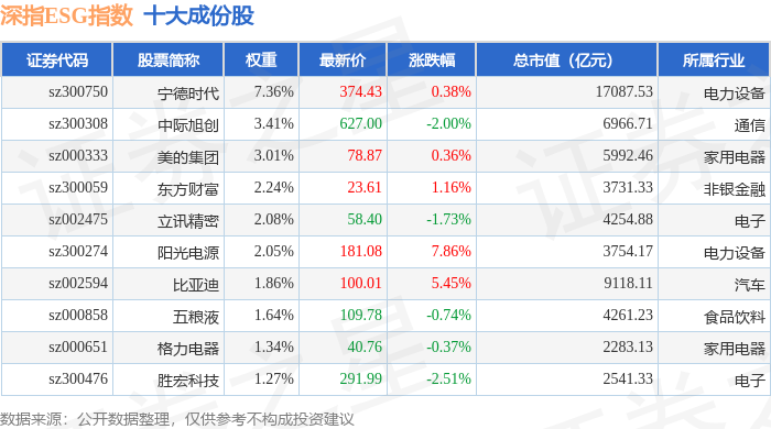 证券之星消息,12月26日,深指ESG(970026)指数报收于14427.27点,涨0.54%,成交4611.75亿元,换手率1.73%。当日该指数成份股中,上涨的有199家,协鑫集成以10.15%的涨幅领涨,下跌的有182家,新诺威以6.77%的跌幅领跌。