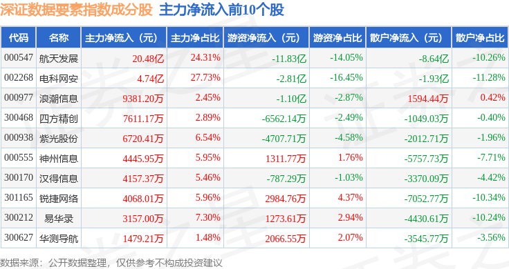 资金流向方面,深证数据要素(970053)指数成份股当日主力资金净流入合计17.76亿元,游资资金净流出合计14.98亿元,散户资金净流出合计2.77亿元。成份股资金流向详情见下表: