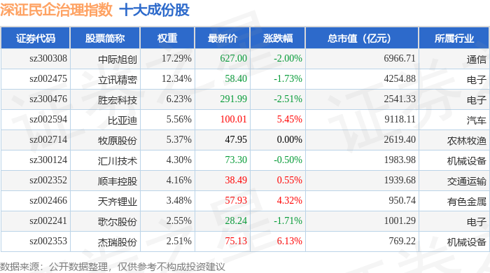 证券之星消息,12月26日,深证民企治理(970058)指数报收于2063.39点,涨0.27%,成交1031.8亿元,换手率2.0%。当日该指数成份股中,上涨的有23家,永兴材料以10.01%的涨幅领涨,下跌的有23家,领益智造以2.78%的跌幅领跌。