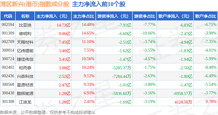 资金流向方面,湾区新兴(港币)(980008)指数成份股当日主力资金净流出合计11.54亿元,游资资金净流出合计12.0亿元,散户资金净流入合计23.55亿元。成份股资金流向详情见下表: