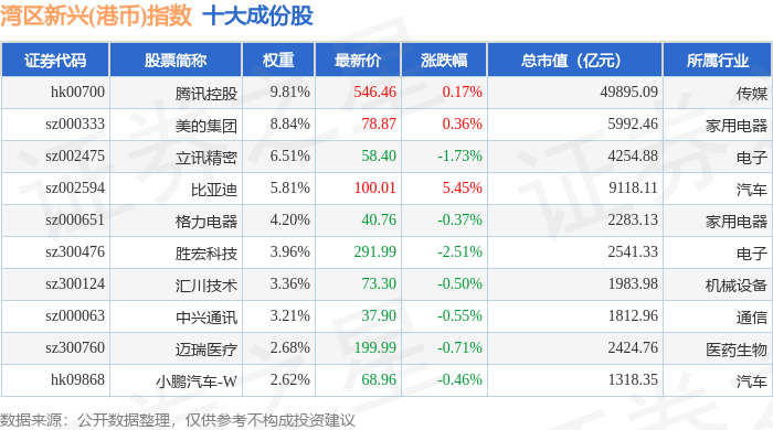 湾区新兴(港币)(980008)指数十大成份股详情如下: