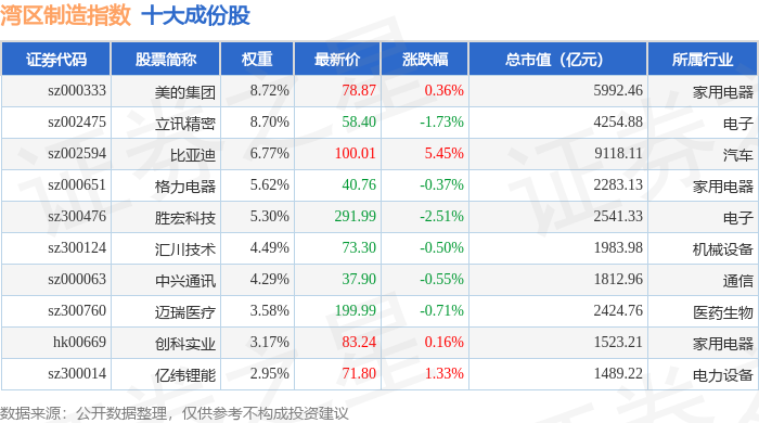 湾区制造(980009)指数十大成份股详情如下: