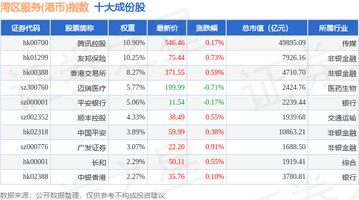 湾区服务(港币)(980012)指数十大成份股详情如下: