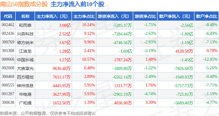 资金流向方面,南山50(980023)指数成份股当日主力资金净流出合计3.15亿元,游资资金净流出合计1.01亿元,散户资金净流入合计4.15亿元。成份股资金流向详情见下表: