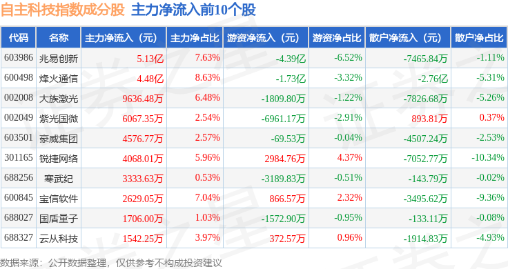 资金流向方面,自主科技(980033)指数成份股当日主力资金净流出合计25.52亿元,游资资金净流入合计8.02亿元,散户资金净流入合计17.5亿元。成份股资金流向详情见下表: