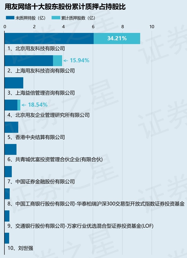 截止本公告日,股东北京用友科技有限公司已累计质押股份3.15亿股,占其持股总数的34.21%,股东上海用友科技咨询有限公司已累计质押股份6250.0万股,占其持股总数的15.94%,股东北京用友企业管理研究所有限公司已累计质押股份2000.0万股,占其持股总数的18.54%。本次质押后用友网络十大股东的累计质押股份占持股比例(占持股比例的计算以公司最新一期财务报表公布的十大股东的持股总数为基准)见下图: