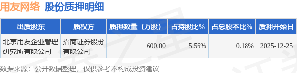 证券之星消息,用友网络(600588)12月26日公开信息显示,股东北京用友企业管理研究所有限公司向招商证券股份有限公司合计质押600.0万股,占总股本0.18%。质押详情见下表:
