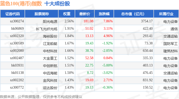蓝色100(港币)(980069)指数十大成份股详情如下:
