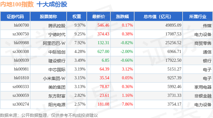 内地100(983001)指数十大成份股详情如下: