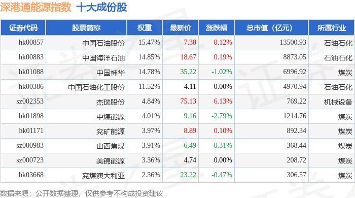 证券之星消息,12月26日,深港通能源(983013)指数报收于6723.72点,涨0.35%,成交37.07亿元,换手率1.23%。当日该指数成份股中,上涨的有15家,杰瑞股份以6.13%的涨幅领涨,下跌的有9家,中煤能源以2.79%的跌幅领跌。