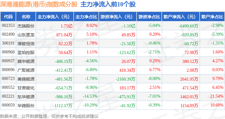 资金流向方面,深港通能源(港币)(983014)指数成份股当日主力资金净流入合计6929.7万元,游资资金净流出合计1.18亿元,散户资金净流入合计4850.62万元。成份股资金流向详情见下表: