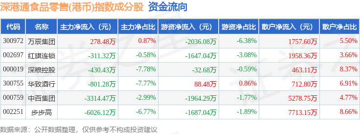 资金流向方面,深港通食品零售(港币)(983038)指数成份股当日主力资金净流出合计1.06亿元,游资资金净流出合计7278.65万元,散户资金净流入合计1.79亿元。成份股资金流向详情见下表: