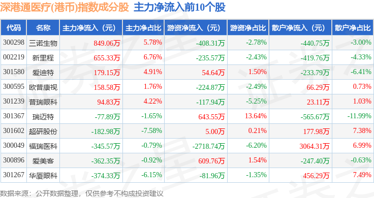 资金流向方面,深港通医疗(港币)(983036)指数成份股当日主力资金净流出合计7.89亿元,游资资金净流入合计3963.27万元,散户资金净流入合计7.5亿元。成份股资金流向详情见下表: