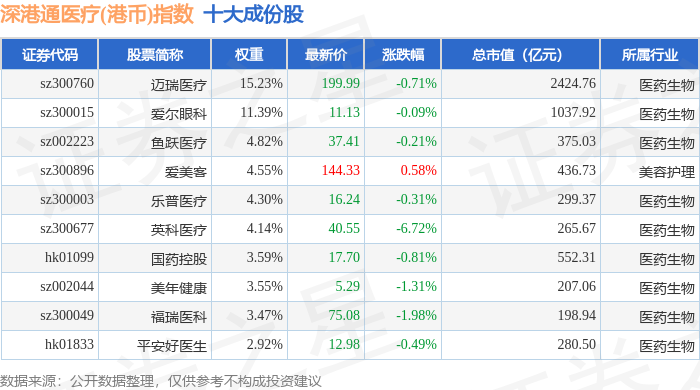 深港通医疗(港币)(983036)指数十大成份股详情如下: