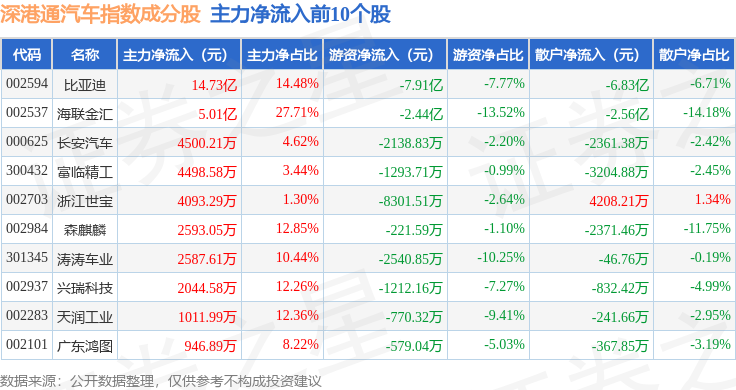 资金流向方面,深港通汽车(983039)指数成份股当日主力资金净流出合计12.38亿元,游资资金净流出合计7.17亿元,散户资金净流入合计19.55亿元。成份股资金流向详情见下表: