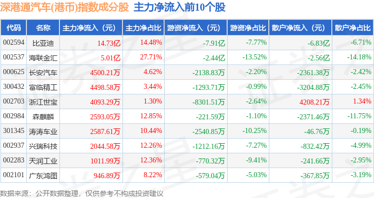 资金流向方面,深港通汽车(港币)(983040)指数成份股当日主力资金净流出合计12.38亿元,游资资金净流出合计7.17亿元,散户资金净流入合计19.55亿元。成份股资金流向详情见下表: