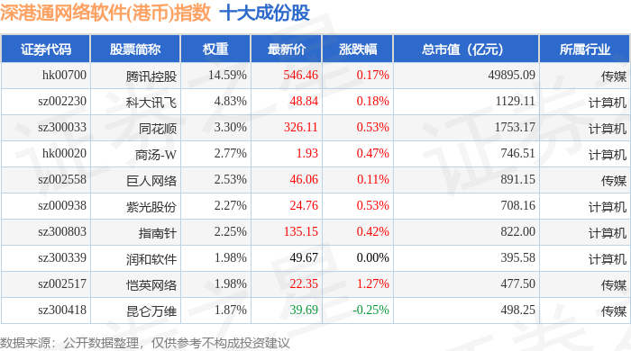 深港通网络软件(港币)(983048)指数十大成份股详情如下: