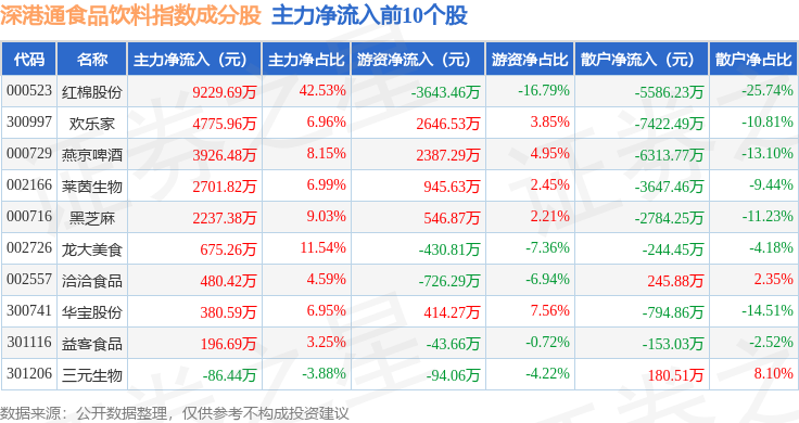 资金流向方面,深港通食品饮料(983065)指数成份股当日主力资金净流出合计5.05亿元,游资资金净流入合计1.52亿元,散户资金净流入合计3.53亿元。成份股资金流向详情见下表: