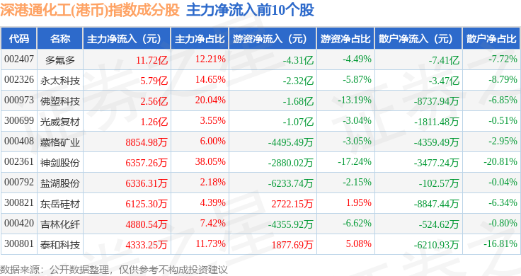 资金流向方面,深港通化工(港币)(983064)指数成份股当日主力资金净流出合计1.19亿元,游资资金净流出合计10.55亿元,散户资金净流入合计11.74亿元。成份股资金流向详情见下表: