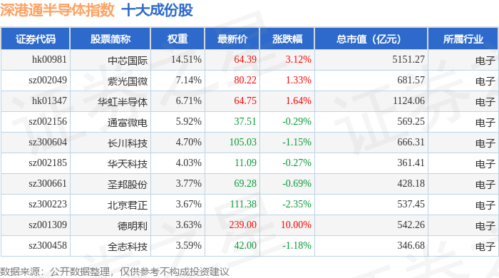 证券之星消息,12月26日,深港通半导体(983067)指数报收于14589.21点,跌0.07%,成交388.59亿元,换手率3.84%。当日该指数成份股中,上涨的有13家,德明利以10.0%的涨幅领涨,下跌的有27家,矽电股份以3.17%的跌幅领跌。
