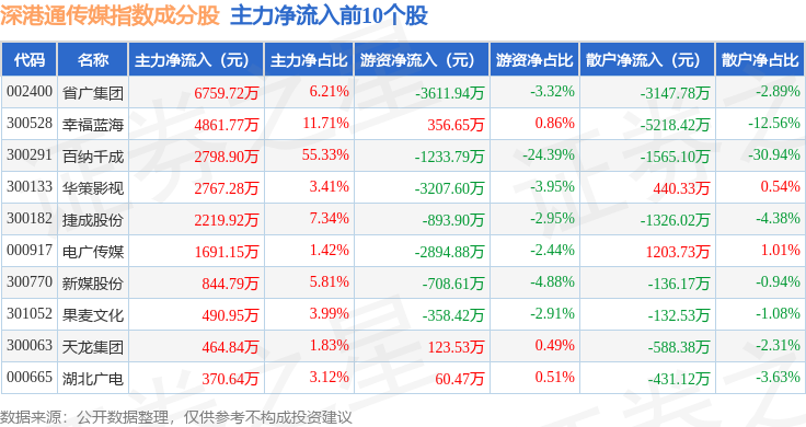 资金流向方面,深港通传媒(983075)指数成份股当日主力资金净流出合计11.44亿元,游资资金净流出合计1242.83万元,散户资金净流入合计11.56亿元。成份股资金流向详情见下表: