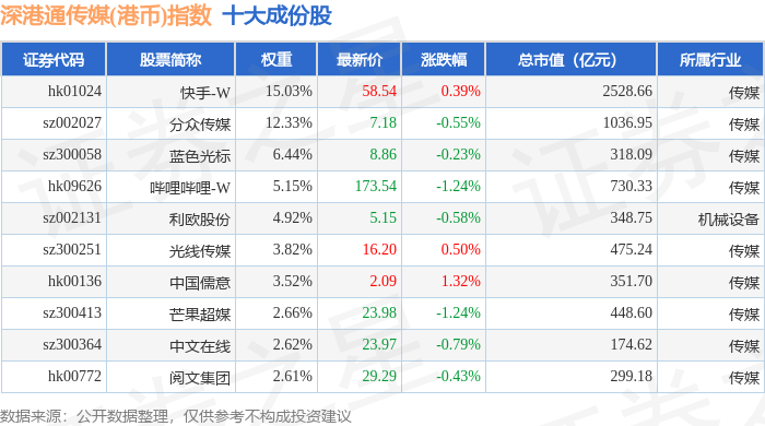 深港通传媒(港币)(983076)指数十大成份股详情如下: