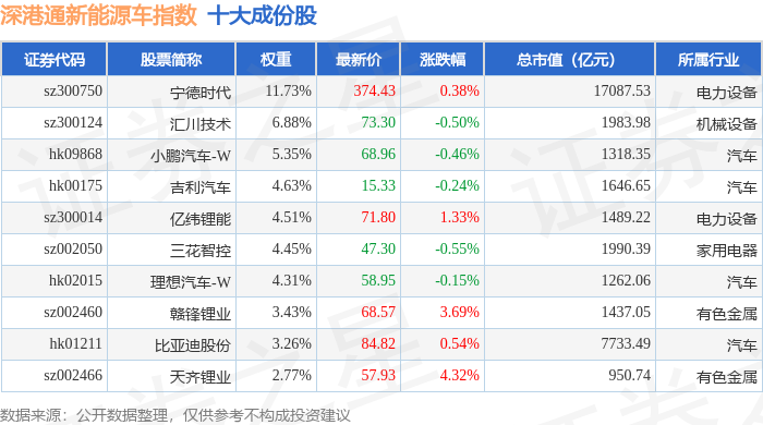 证券之星消息,12月26日,深港通新能源车(983087)指数报收于6093.73点,涨1.41%,成交1123.64亿元,换手率3.72%。当日该指数成份股中,上涨的有31家,永兴材料以10.01%的涨幅领涨,下跌的有18家,麦格米特以4.87%的跌幅领跌。