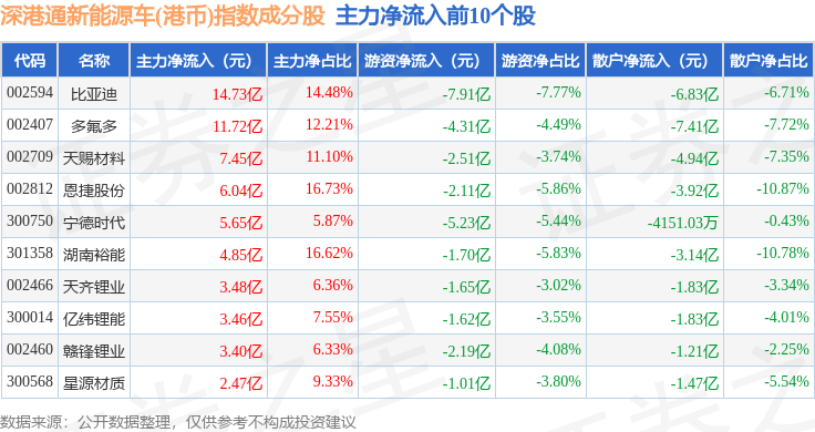 资金流向方面,深港通新能源车(港币)(983088)指数成份股当日主力资金净流入合计50.45亿元,游资资金净流出合计27.31亿元,散户资金净流出合计23.14亿元。成份股资金流向详情见下表:
