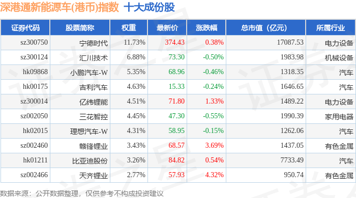 深港通新能源车(港币)(983088)指数十大成份股详情如下: