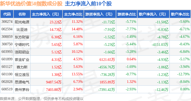 资金流向方面,新华优选价值50(989004)指数成份股当日主力资金净流出合计17.47亿元,游资资金净流入合计18.02亿元,散户资金净流出合计5506.61万元。成份股资金流向详情见下表:
