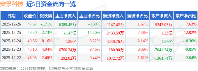 证券之星消息,截至2025年12月26日收盘,安孚科技(603031)报收于47.67元,下跌1.71%,换手率6.75%,成交量14.25万手,成交额6.87亿元。