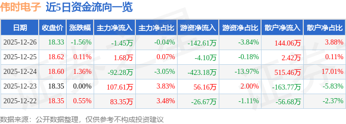 证券之星消息,截至2025年12月26日收盘,伟时电子(605218)报收于18.33元,下跌1.56%,换手率0.95%,成交量2.02万手,成交额3710.72万元。