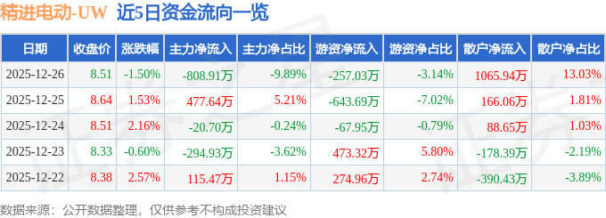 证券之星消息,截至2025年12月26日收盘,精进电动(688280)报收于8.51元,下跌1.5%,换手率1.84%,成交量9.56万手,成交额8180.65万元。